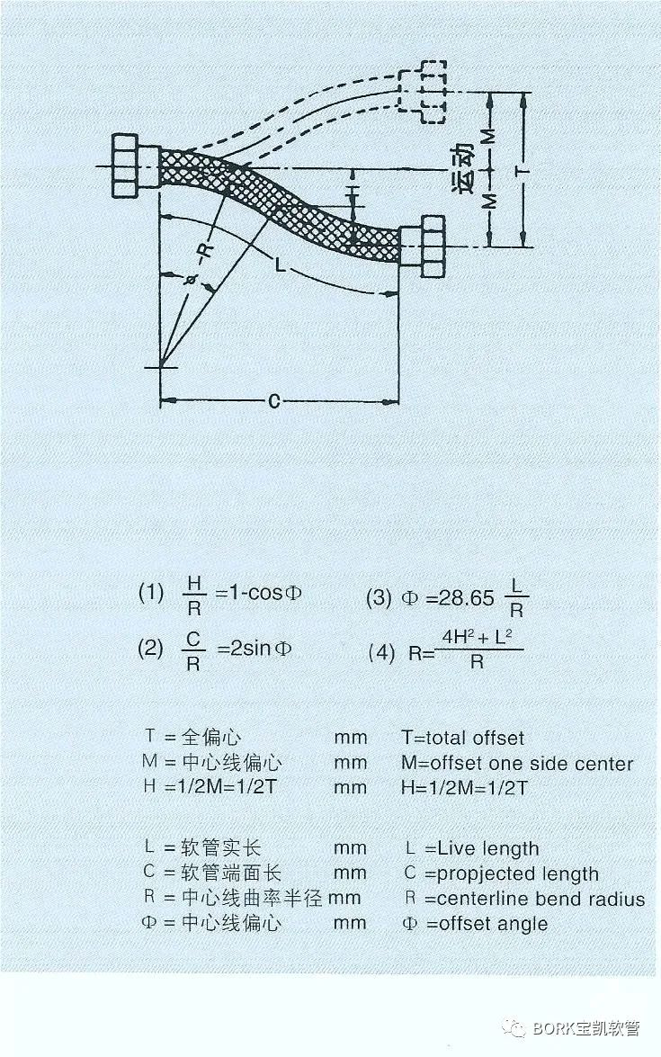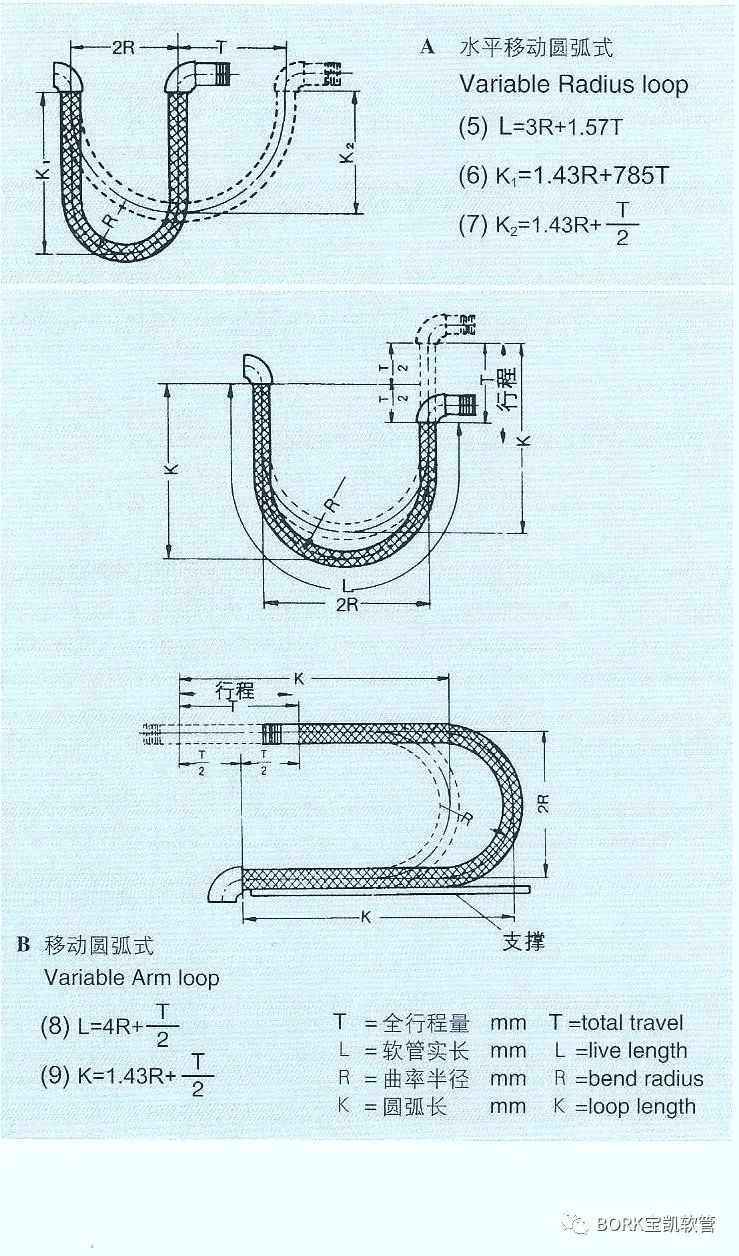 径向运动是指按图A、B弯曲装配时,圆弧始点的水平或垂直运动,一般称为移动圆弧,移动量用水平或垂直移动距离表示。如果全移动量T已知,由率半径选择合适的话,软管实长L和圆弧的长K可以根据所示的公式计算。