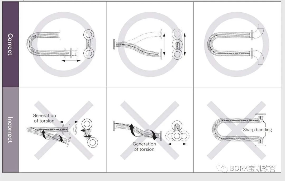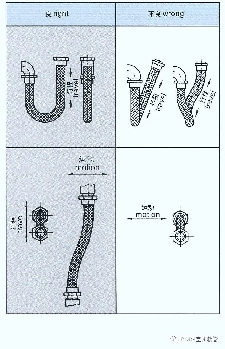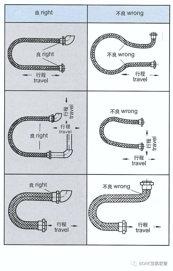 软管在装配时不可避免的会产生弯曲,但经常由于错误的安装使软管产生急剧弯曲,下图是其三例。在小于最小弯曲半径条件下使用软管时,易产生疲劳,造成软管在短期内破损。