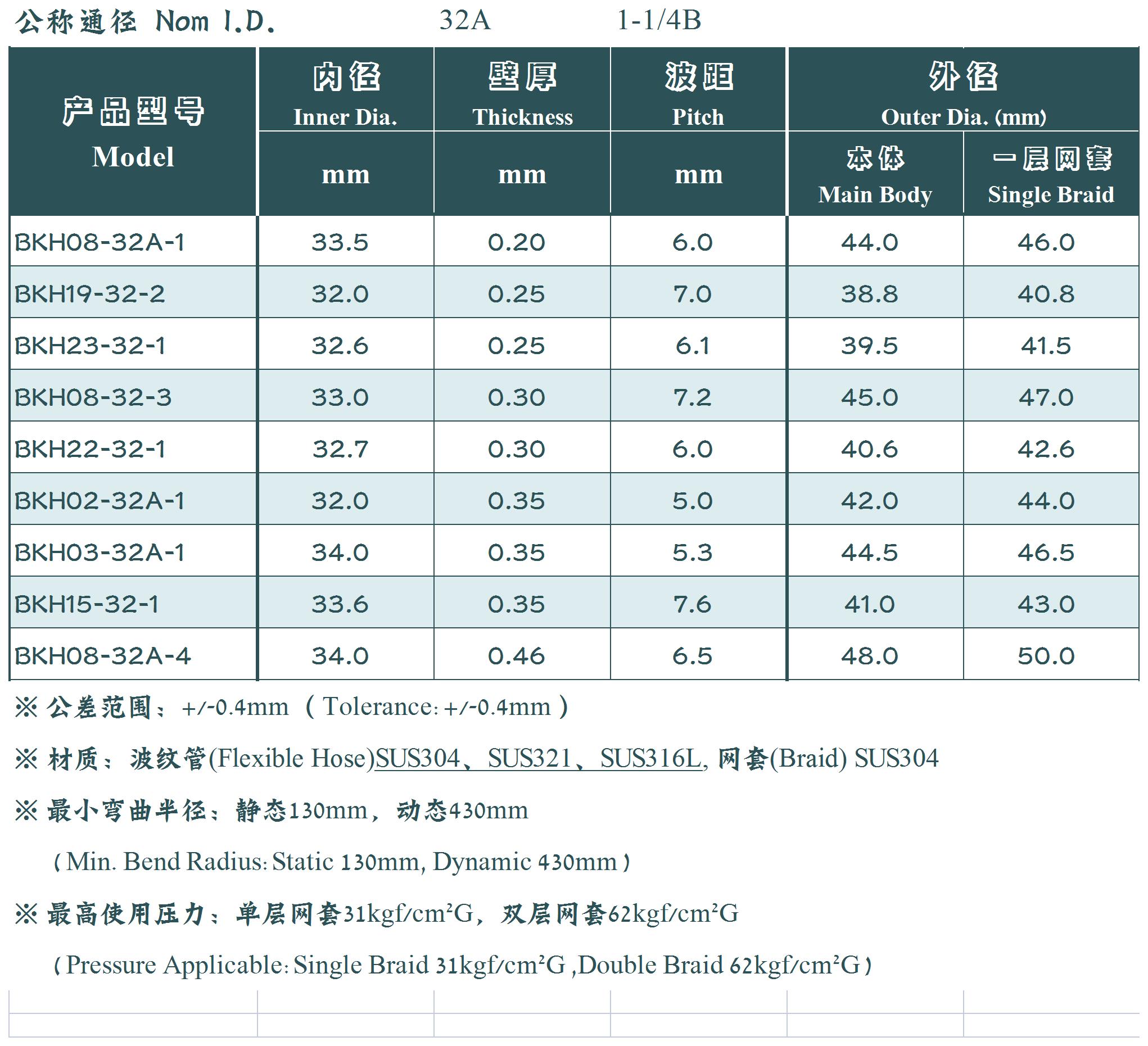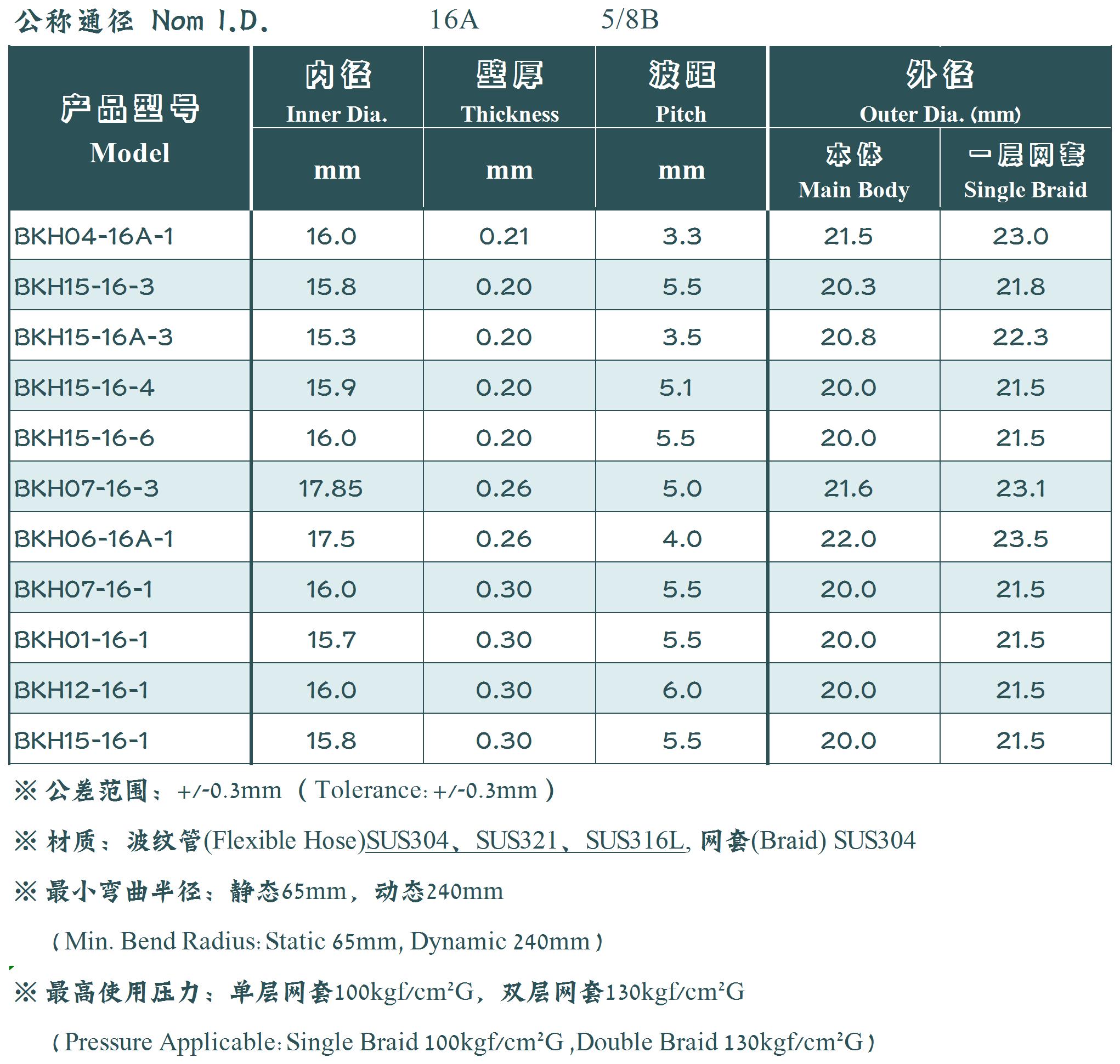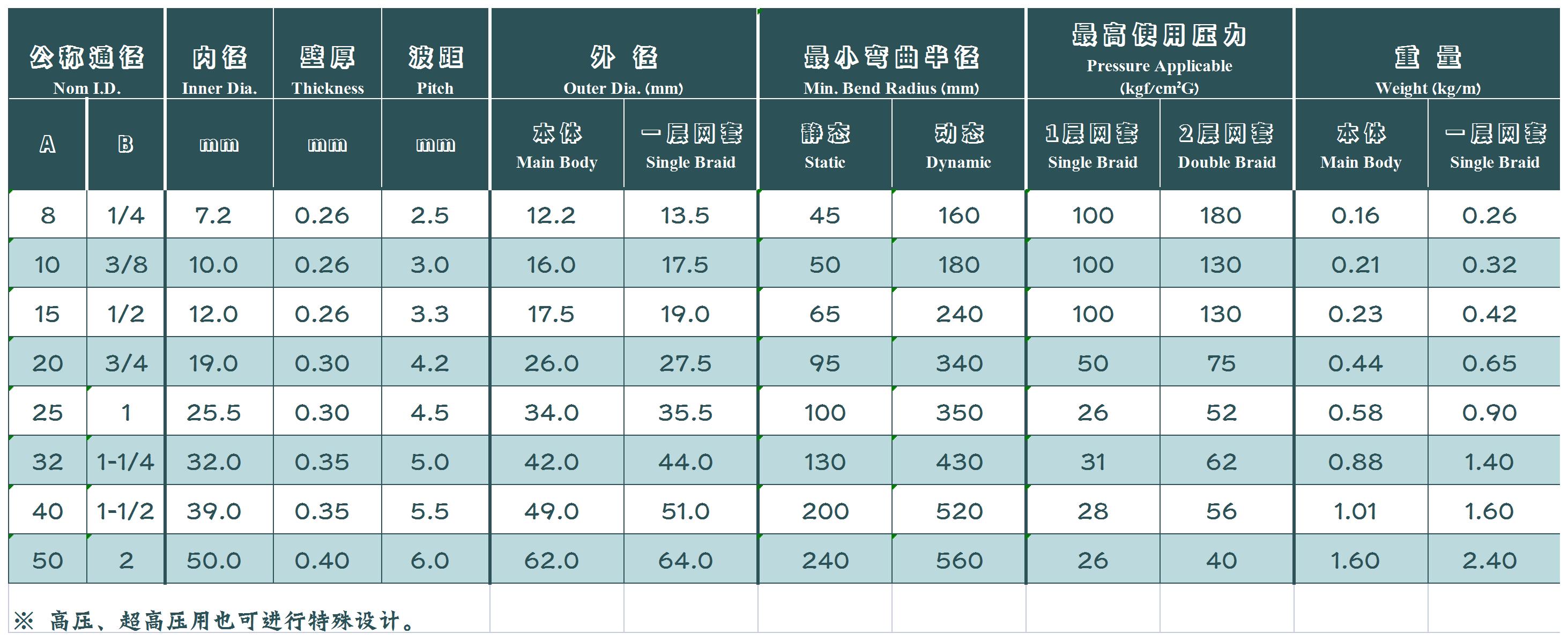 A型管体参数表